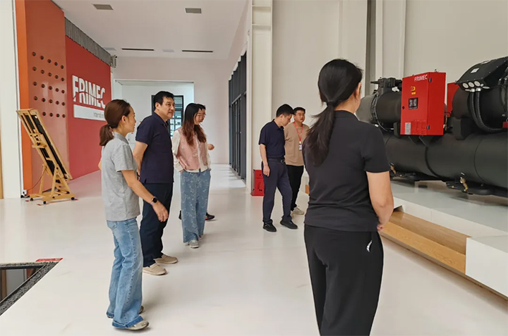 随后,调研组前往商会会员单位孚莱美科(江苏)环境科技有限公司。在孚莱美科厂长田会敏、企业主管王殷琪的引导下,吴书记与赵书记一行参观了企业产品陈列展厅及企业文化展示。作为全球空调设备领域的领军企业,孚莱美科品牌始于1953年,总部位于葡萄牙,业务覆盖全球。2019年,企业与中国战略合作伙伴在镇江投资建厂,打造集研发、生产、销售、售后于一体的专业化基地,主要生产商业空调等高端设备,产品涵盖风冷螺杆机组、气悬浮变频离心式冷水机组、屋顶式空气调节机组等六大系列,广泛应用于大型商业综合体、数据中心、工业制造等领域。田厂长介绍,中国工厂是维克集团全球四大生产基地之一,已建立覆盖全国30余个省市的销售服务网点,国外产品主要销往东南亚等地区。