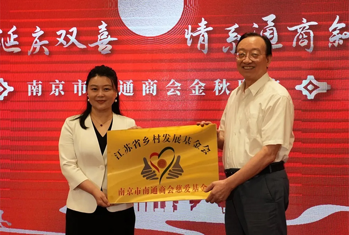 在全场瞩目下,仪式进入基金授牌环节。江苏省乡村发展基金会副理事长张晓未手持基金冠名牌,郑重授予南京市南通商会,商会代表康慧接牌时的庄重神情,彰显出商会对这份公益使命的珍视与担当。这枚冠名牌不仅是一份荣誉,更是一份沉甸甸的责任,象征着双方将以基金为纽带,深度合作推动乡村公益事业落地。